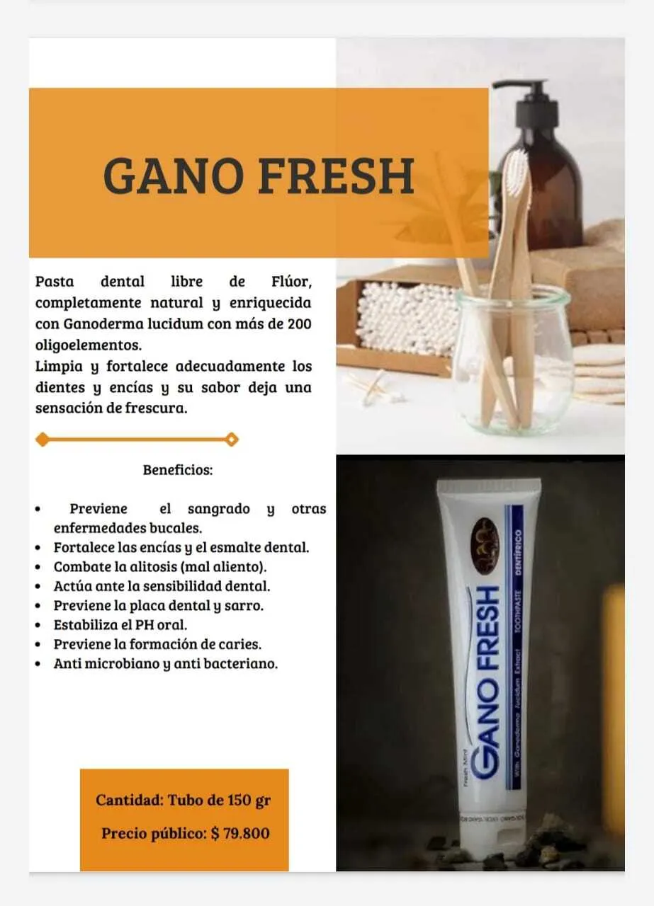 Pasta dental, libre de flúor realizada con la formula especial de Extracto de Ganoderma Lucidum y con un fresco sabor a menta. Gano Fresh Toothpaste limpia suave y efectivamente los dientes, las encías dejando un sabor refrescante en su boca.