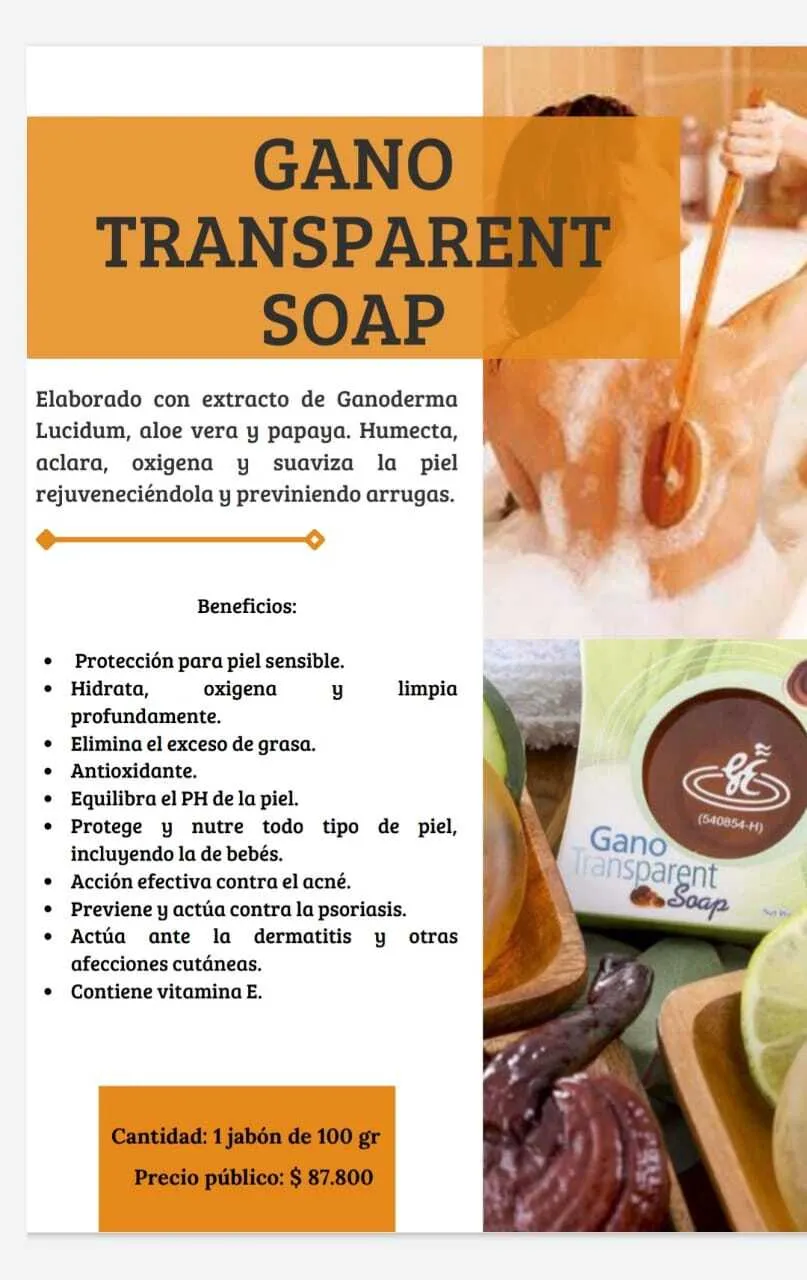 Único Jabón de baño, elaborado con extracto de Ganoderma Lucidum, Aloe Vera y Papaya. Humecta, aclara y suaviza la piel, rejuveneciéndola y previniendo arrugas.